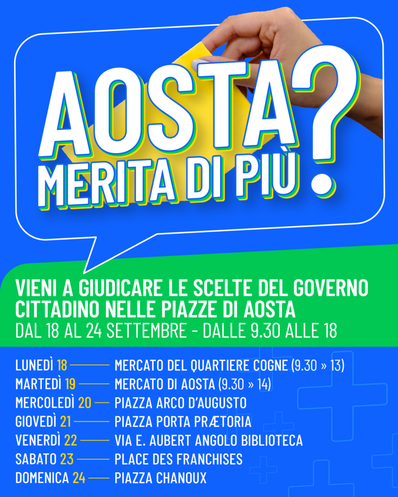 Vieni a dircelo nei gazebo che terremo ad Aosta dal 18 al 24 settembre.
