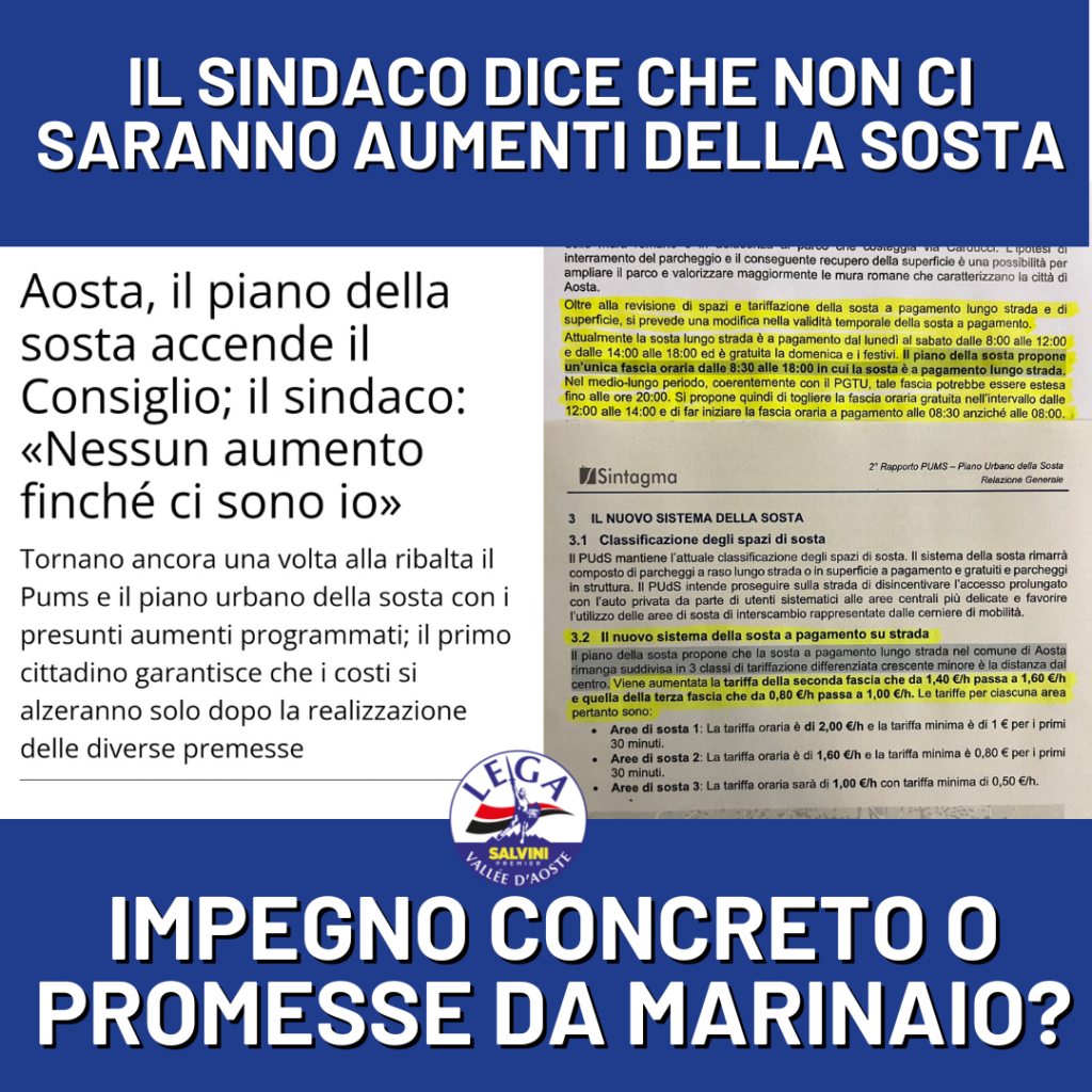 Nell’ultima seduta del Consiglio comunale, il Gruppo Lega ha presentato una mozione che chiedeva di non aumentare le tariffe per la sosta nella città di Aosta, così come previsto dal Piano della mobilità sostenibile. La Lega è infatti contraria alla guerra dichiarata da questa amministrazione alle macchine ed ai loro possessori, considerando che questi aumenti colpiranno direttamente cittadini ed attività commerciali.