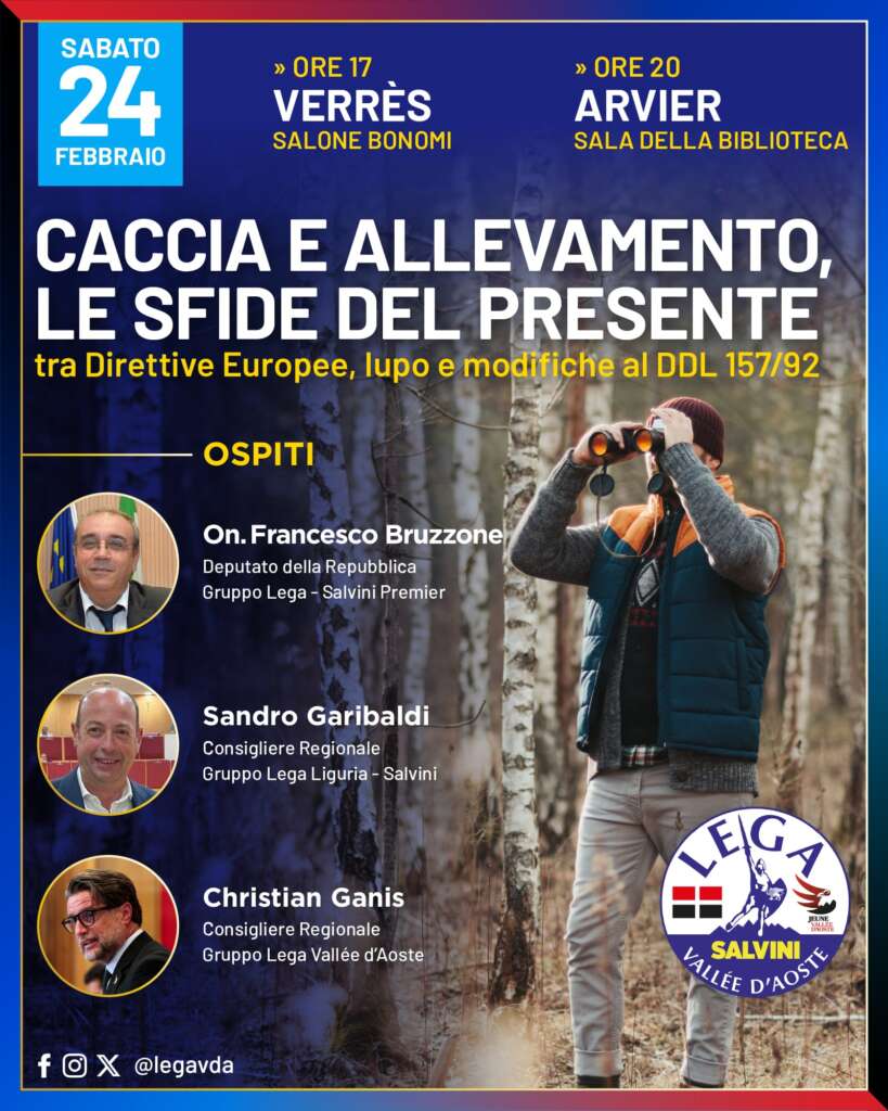 Parteciperanno all’incontro: il Consigliere regionale della Lega in Valle d’Aosta Christian Ganis; il Consigliere regionale della Lega Liguria Sandro Garibaldi; l’On. Francesco Bruzzone, vice Presidente del Gruppo Lega alla Camera dei Deputati responsabile del Dipartimento e Presidente del Dipartimento per la gestione della fauna della Lega Salvini Premier.