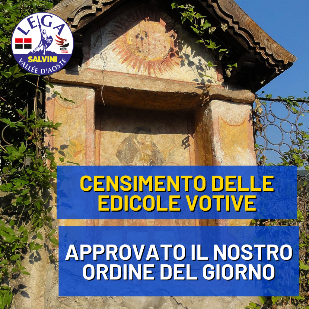 Nello specifico l’ordine del giorno impegna il Governo regionale ad avviare, entro 90 giorni, un percorso di interlocuzione con la Diocesi di Aosta e con il CELVA, al fine di intraprendere un percorso che porti all’avvio di un’attività di censimento (individuazione, ubicazione, inquadramento storico e proprietà di competenza) di tutte le edicole devozionali e votive presenti nel territorio della Valle d’Aosta.