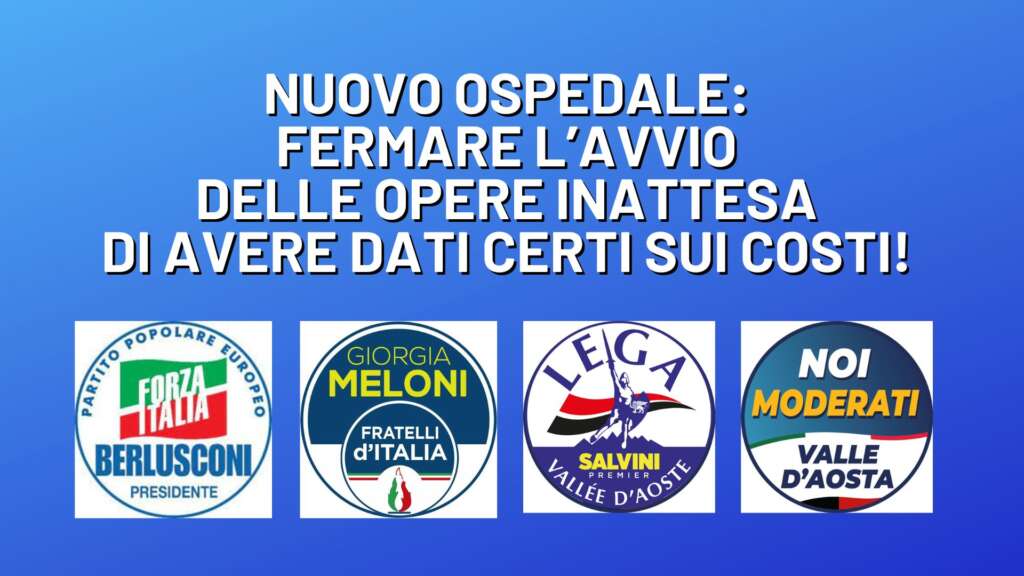In queste condizioni, per senso di responsabilità e nell’interesse dei cittadini valdostani, si chiede al governo di fermare immediatamente le procedure finalizzate all’avvio delle opere in attesa di avere tutti i dati sulla fattibilità tecnico economica dell’intera opera di costruzione del nuovo ospedale unico della Valle d’Aosta, anche al fine di poter valutare eventuali soluzioni alternative così come previsto dalle norme vigenti e dai principi elementari di buona amministrazione.