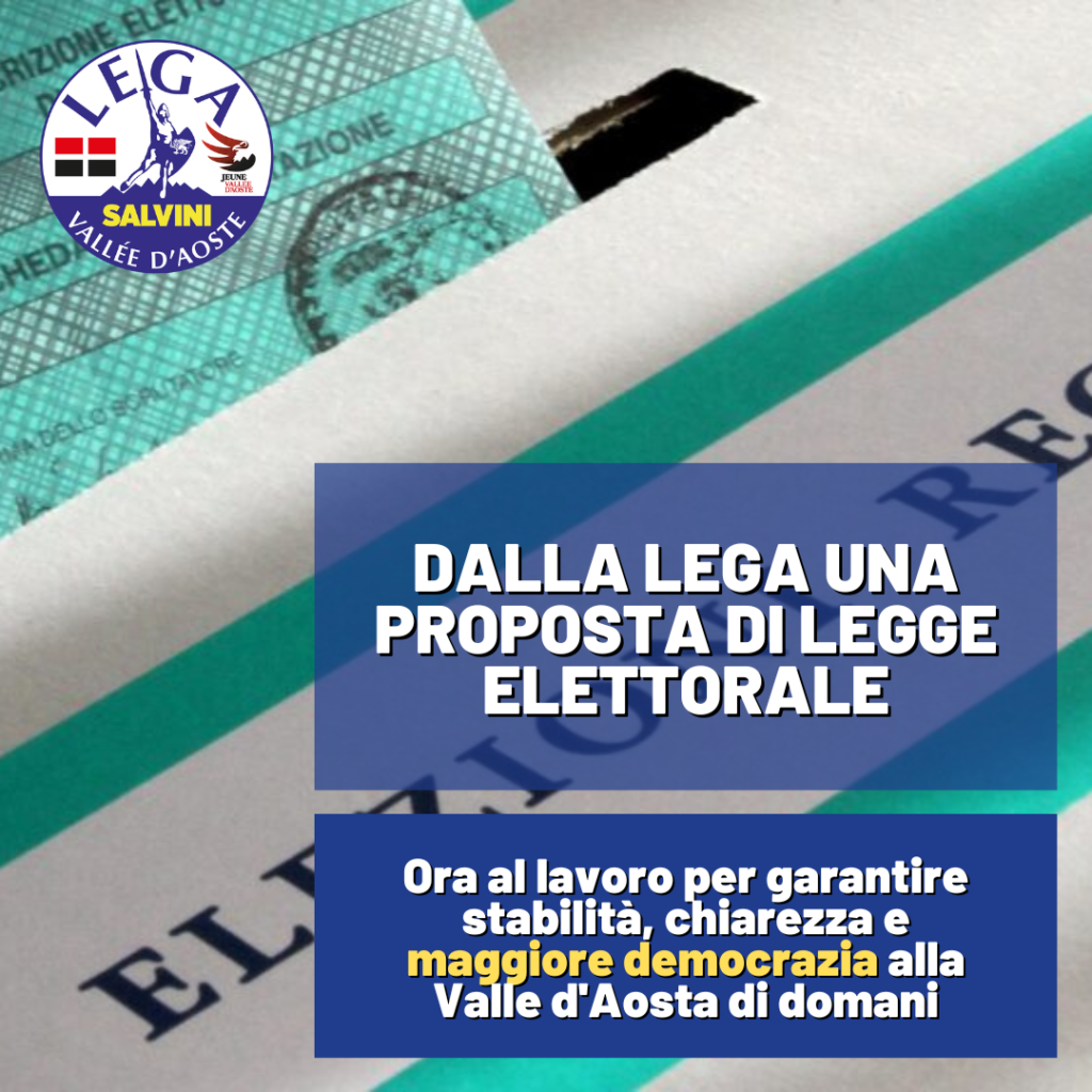 Tenuto conto dell’importanza che il tema della revisione della legge elettorale riveste per il futuro della nostra Regione, poiché quando si scrivono le regole del gioco vi è la necessità di trovare la più ampia convergenza possibile, la Lega Vallée d’Aoste si dichiara fin da ora disponibile a dialogare e lavorare con le forze presenti in Consiglio, per elaborare la miglior legge elettorale possibile, a partire dall’area del Centrodestra con cui si è avviato un tavolo sul tema, che possa garantire stabilità, chiarezza e maggiore democrazia alla Valle d’Aosta di domani.