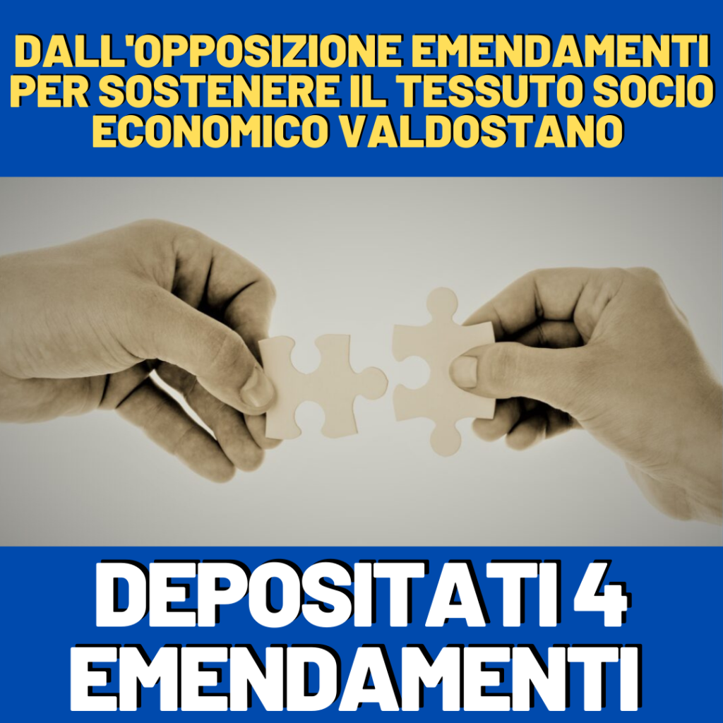 Nella mattinata di oggi i Gruppi consiliari Lega Vallée d’Aoste, Forza Italia Valle d’Aosta e Pour l’Autonomie hanno depositato quattro emendamenti: il primo emendamento è relativo alla proposta di Regolamento regionale n. 1 contenente la nuova disciplina dei requisiti igienico-sanitari per l’esercizio delle attività di somministrazione di alimenti e bevande, ai sensi dell’articolo 20, comma 5, della legge regionale 3 gennaio 2006, n. 1; gli altri tre sono relativi al Disegno di legge n. 81 recante “Interventi regionali per lo sviluppo dell’imprenditoria giovanile e femminile nei settori dell’industria e dell’artigianato”.