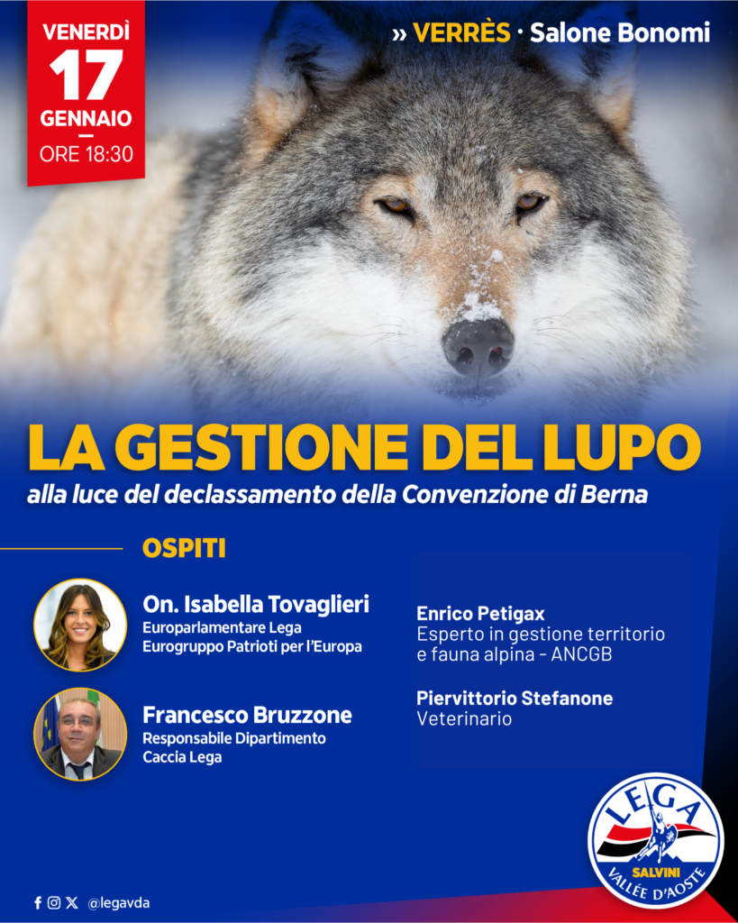 La gestione del lupo alla luce del declassamento della Convenzione di Berna: sarà questo il tema al centro dell’evento organizzato dalla Lega Vallée d’Aoste per il prossimo 17 gennaio. All’incontro parteciperanno l’Europarlamentare Isabella Tovaglieri e il responsabile del Dipartimento caccia della Lega Salvini Premier Francesco Bruzzone.