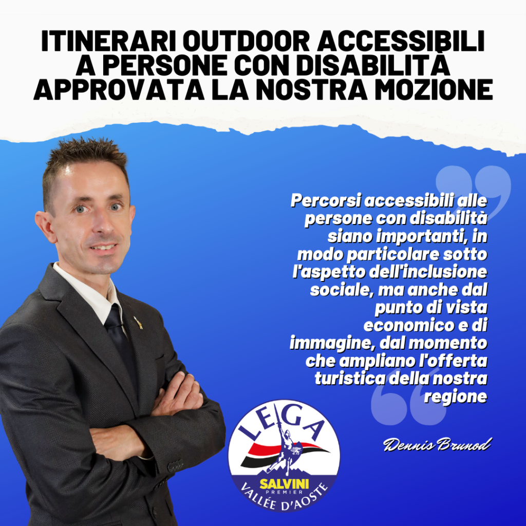 Ieri è stata approvata all’unanimità la nostra mozione che chiede di valorizzare gli itinerari outdoor accessibili a persone con disabilità. L’intento è quello di creare una pagina sul portale www.lovevda.it, prima dell’avvio della prossima stagione turistica in cui saranno riportati i percorsi e gli itinerari outdoor che si prestano alla fruizione da parte delle persone con disabilità e di cui è garantita dalle Amministrazioni stesse la regolare manutenzione e percorribilità.