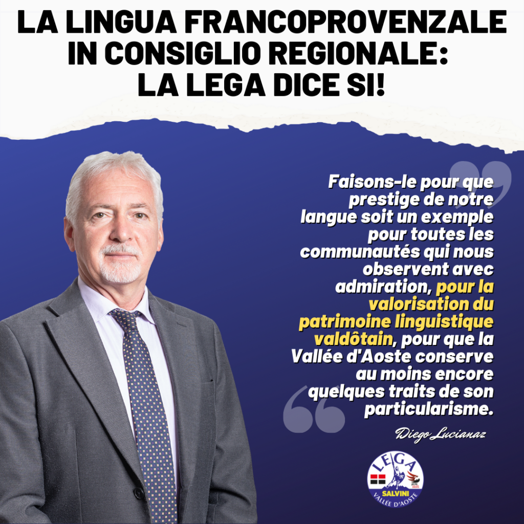 In Consiglio regionale è stata approvata la nostra mozione che impegna il Presidente del Consiglio regionale a modificare, quanto prima, il Regolamento del Consiglio regionale al fine di consentire l’uso della millenaria lingua valdostana anche nelle sedute pubbliche dell’Assemblea regionale.