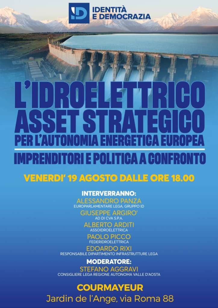 L’idroelettrico quale asset strategico per l’autonomia energetica europea: ne parleremo venerdì 19 agosto a Courmayeur alle ore 18 presso il Jardin de l’Ange, insieme all’europarlamentare ID (Lega) Alessandro Panza, membro della Commissione per lo sviluppo regionale, all’On. Edoardo Rixi e agli imprenditori del settore Giuseppe Argirò, Amministratore delegato di CVA S.p.A., Alberto Arditi, referente regionale di Assoidroelettrica e Paolo Picco, Presidente di Federidroelettrica.