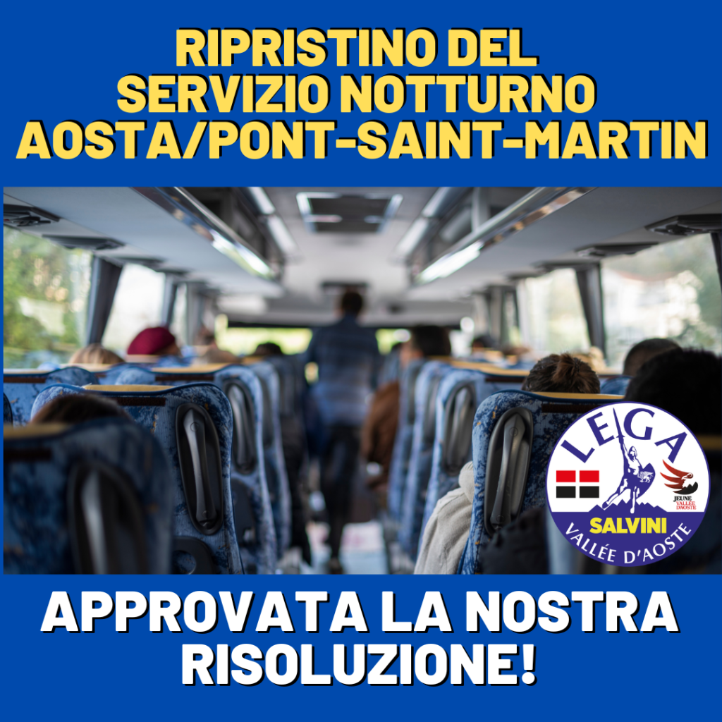 È stata approvata la nostra risoluzione, presentata insieme al Gruppo Forza Italia, che impegna l’Assessore competente a presentare in quarta Commissione, alla conclusione della fase di analisi delle attuali criticità e di riprogrammazione dei servizi, il progetto di eventuale riavvio del trasporto notturno Aosta/Pont-Saint-Martin/Aosta.