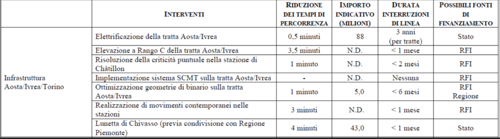 Non ultima, la riduzione dei tempi di percorrenza della tratta che, a fronte della realizzazione di tutti gli interventi prospettati sulla infrastruttura della Aosta/Ivrea/Torino, verrebbe stimata in 13 minuti e costerebbe complessivamente 136 milioni di euro in quanto, oltre agli 88 milioni già contabilizzati, andrebbero aggiunti ulteriori 48 milioni di interventi sulla linea!