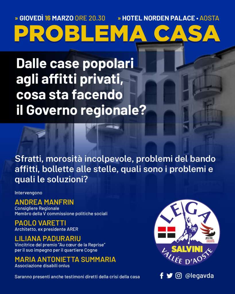 Per questo il Gruppo consiliare Lega Vallée d’Aoste organizza, per giovedì 16 marzo alle 20.30 presso l’Hotel Norden Palace di Aosta, una serata di approfondimento sul problema casa, sia pubblica che privata.