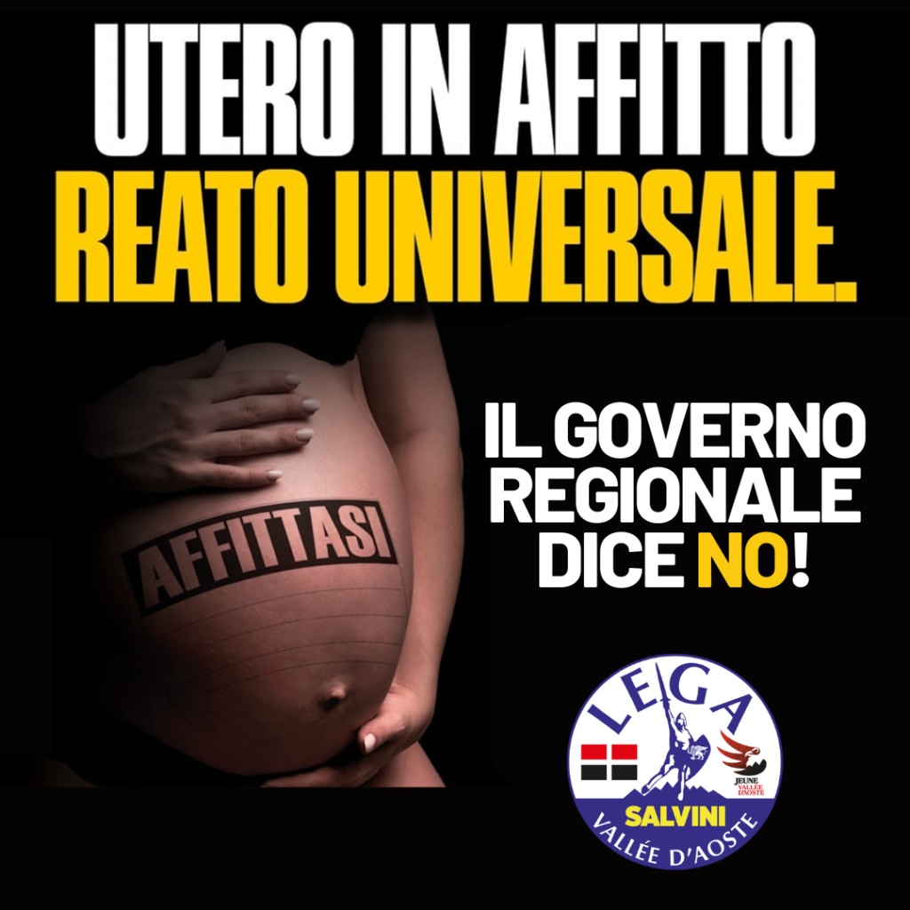 In Consiglio regionale abbiamo presentato una mozione per impegnare il Consiglio regionale a condannare la maternità surrogata in quanto atto esecrabile poiché porta alla mercificazione del corpo della donna ed è inoltre lesivo dei diritti del minore che viene procreato e ad esprimere ai parlamentari valdostani, il sostegno del Consiglio Regionale alla proposta di legge n. 306 del 23 marzo 2018 che dichiara la procreazione per altri reato universale.